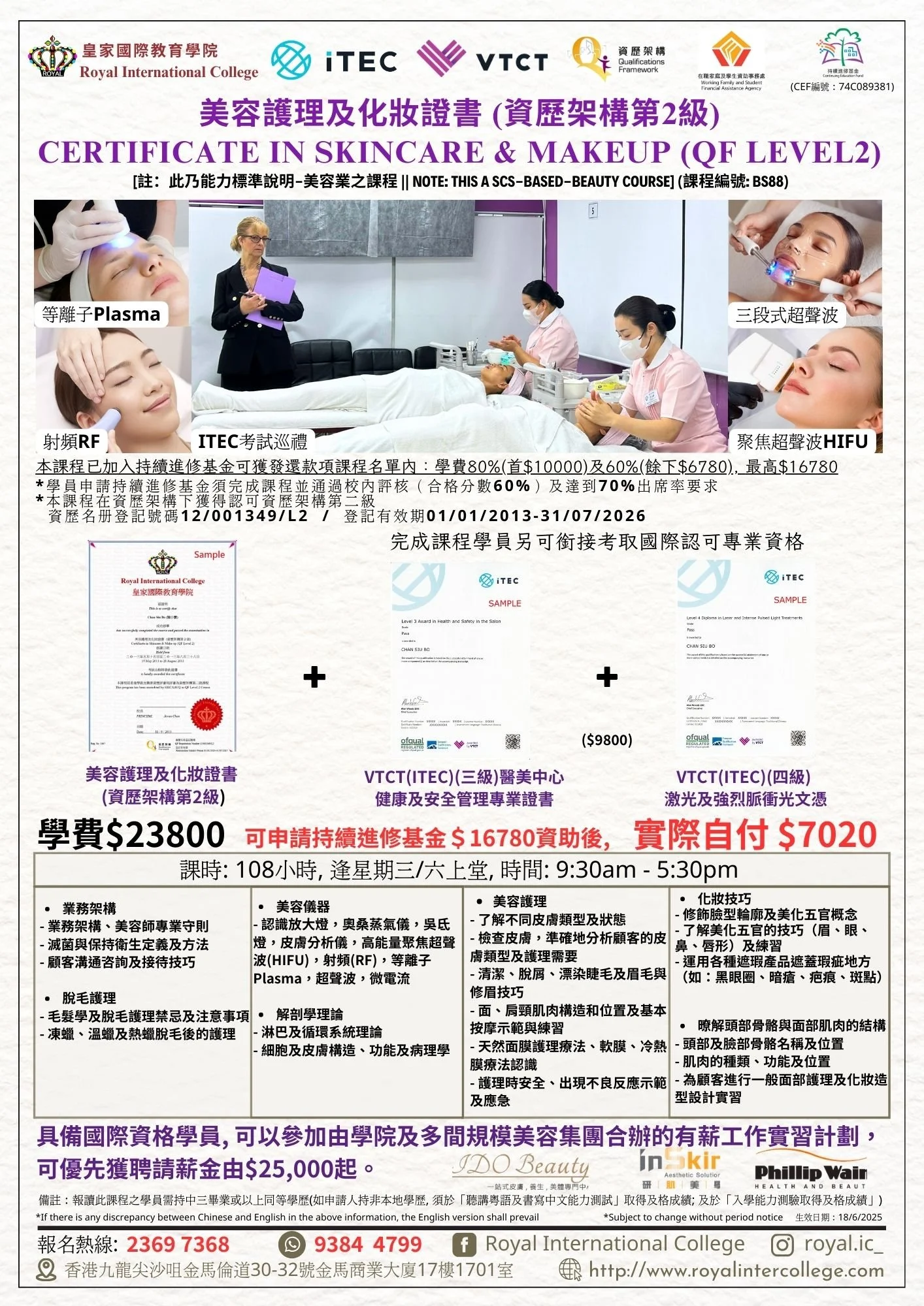 可申請持續進修基金(CEF編號:74C089381),亦為ITEC國際電療儀器治療師文憑課程(F0703)之輔修課程。